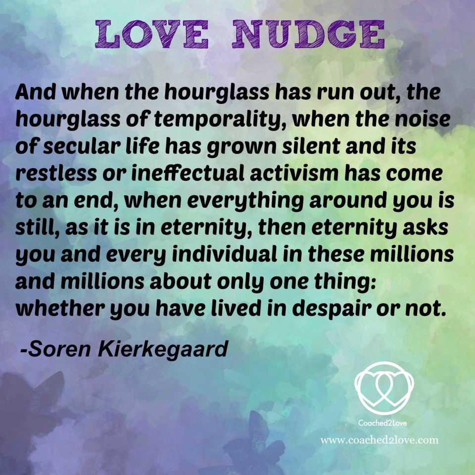 And when the hourglass has run out, the hourglass of temporality, when the noise of secular life has grown silent and its restless or ineffectual activism has come to an end, when everything around you is still, as it is in eternity, then eternity ask you and every individual in these millions and millions about only one thing: whether you have lived in despair or not. #SorenKierkegaard #LoveNudge http://www.Coached2Love.com